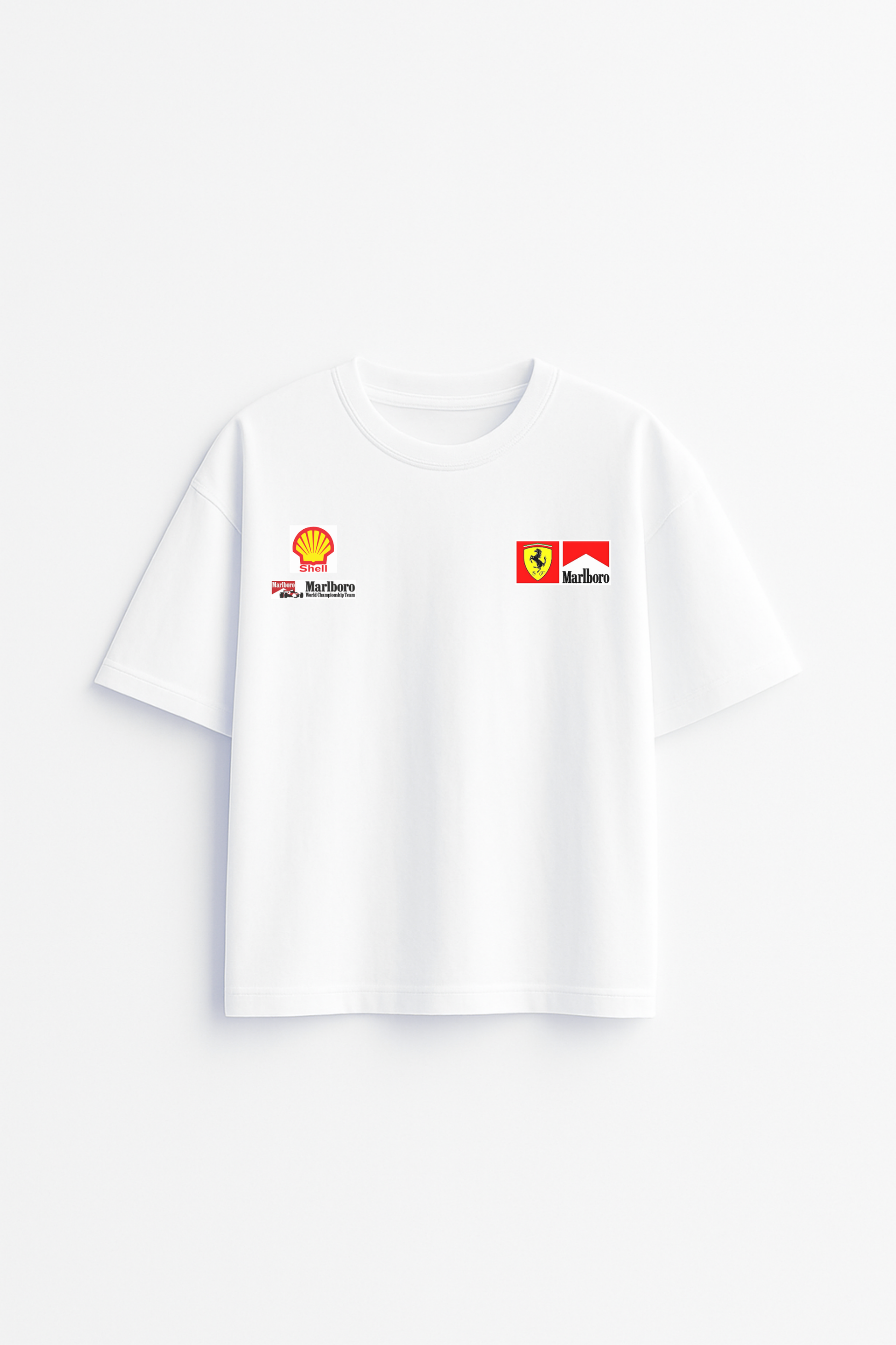 CRAFTED FROM ULTRA-PREMIUM HEAVYWEIGHT COTTON, THIS PURE WHITE TEE IS DESIGNED FOR THE DISCERNING ENTHUSIAST WHO APPRECIATES BOTH PERFORMANCE AND STYLE. THE FRONT IS ADORNED WITH LEGENDARY F1 SPONSOR LOGOS INCLUDING THE PRANCING HORSE EMBLEM, PAYING TRIBUTE TO THE POWER, SPEED, AND PRESTIGE OF RACING ROYALTY. THE BACK FEATURES A STRIKING LARGE-SCALE RACING TEAM GRAPHIC, BRINGING THE SPIRIT OF THE PIT LANE AND PODIUM INTO EVERY THREAD.